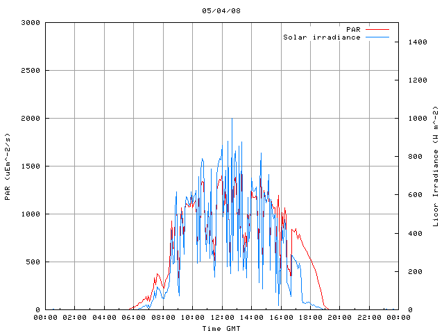 The PML meteorological station, situated on the south-west corner of the building roof, consists of a Hygroclip S3 temperature and humidity sensor housed in a radiation shield, a Mierij Meteo solid state wind sensor (MMW-005), a Chelsea instruments half-hemisphere PAR sensor, a Li-Cor pyranometer (LI-200SZ) and an Omni Instruments 6" tipping bucket raingauge (RG200). The data are logged every 5 minutes using a Pace Scientific XR5 data logger. The real-time rainfall data is likely in error - the correct values will be displayed after a time lag of approximately 24 hours. The meteorological station is sheltered from winds in the north-east and underestimates winds from this quarter. To use these data please contact Dr Tim Smyth.