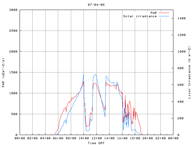 The PML meteorological station, situated on the south-west corner of the building roof, consists of a Hygroclip S3 temperature and humidity sensor housed in a radiation shield, a Mierij Meteo solid state wind sensor (MMW-005), a Chelsea instruments half-hemisphere PAR sensor, a Li-Cor pyranometer (LI-200SZ) and an Omni Instruments 6" tipping bucket raingauge (RG200). The data are logged every 5 minutes using a Pace Scientific XR5 data logger. The real-time rainfall data is likely in error - the correct values will be displayed after a time lag of approximately 24 hours. The meteorological station is sheltered from winds in the north-east and underestimates winds from this quarter. To use these data please contact Dr Tim Smyth.