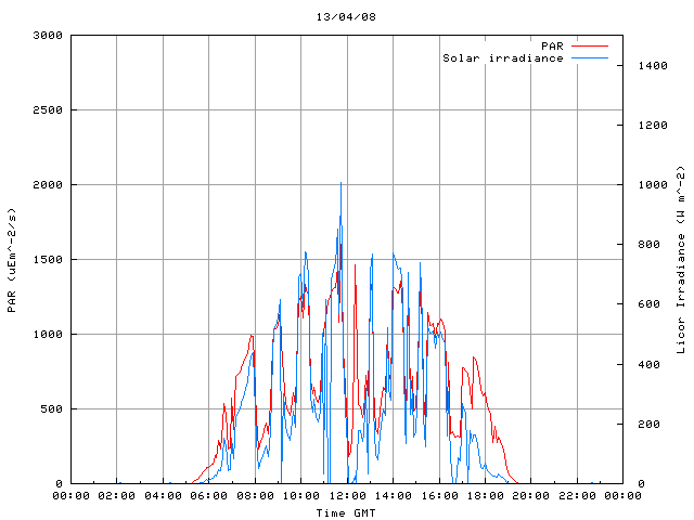 The PML meteorological station, situated on the south-west corner of the building roof, consists of a Hygroclip S3 temperature and humidity sensor housed in a radiation shield, a Mierij Meteo solid state wind sensor (MMW-005), a Chelsea instruments half-hemisphere PAR sensor, a Li-Cor pyranometer (LI-200SZ) and an Omni Instruments 6" tipping bucket raingauge (RG200). The data are logged every 5 minutes using a Pace Scientific XR5 data logger. The real-time rainfall data is likely in error - the correct values will be displayed after a time lag of approximately 24 hours. The meteorological station is sheltered from winds in the north-east and underestimates winds from this quarter. To use these data please contact Dr Tim Smyth.