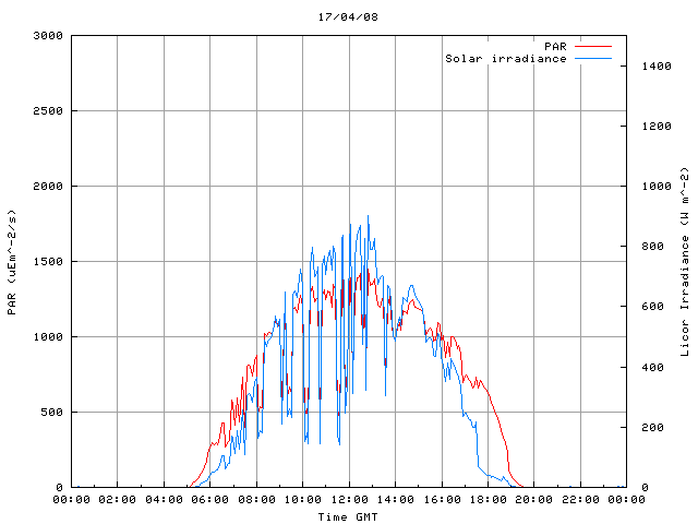 The PML meteorological station, situated on the south-west corner of the building roof, consists of a Hygroclip S3 temperature and humidity sensor housed in a radiation shield, a Mierij Meteo solid state wind sensor (MMW-005), a Chelsea instruments half-hemisphere PAR sensor, a Li-Cor pyranometer (LI-200SZ) and an Omni Instruments 6" tipping bucket raingauge (RG200). The data are logged every 5 minutes using a Pace Scientific XR5 data logger. The real-time rainfall data is likely in error - the correct values will be displayed after a time lag of approximately 24 hours. The meteorological station is sheltered from winds in the north-east and underestimates winds from this quarter. To use these data please contact Dr Tim Smyth.