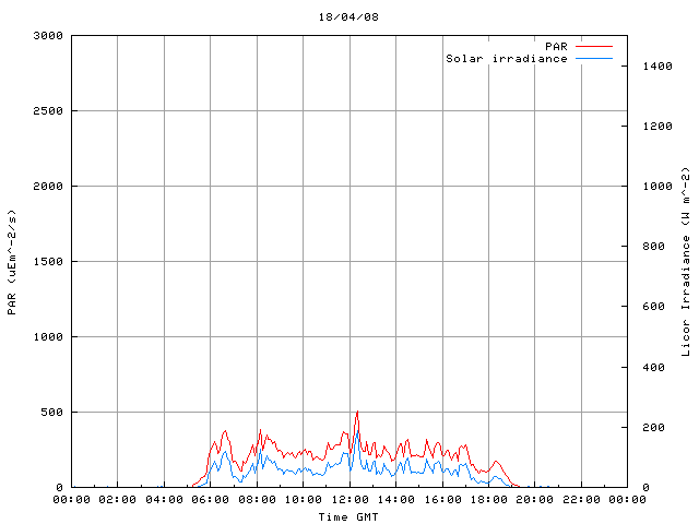 The PML meteorological station, situated on the south-west corner of the building roof, consists of a Hygroclip S3 temperature and humidity sensor housed in a radiation shield, a Mierij Meteo solid state wind sensor (MMW-005), a Chelsea instruments half-hemisphere PAR sensor, a Li-Cor pyranometer (LI-200SZ) and an Omni Instruments 6" tipping bucket raingauge (RG200). The data are logged every 5 minutes using a Pace Scientific XR5 data logger. The real-time rainfall data is likely in error - the correct values will be displayed after a time lag of approximately 24 hours. The meteorological station is sheltered from winds in the north-east and underestimates winds from this quarter. To use these data please contact Dr Tim Smyth.