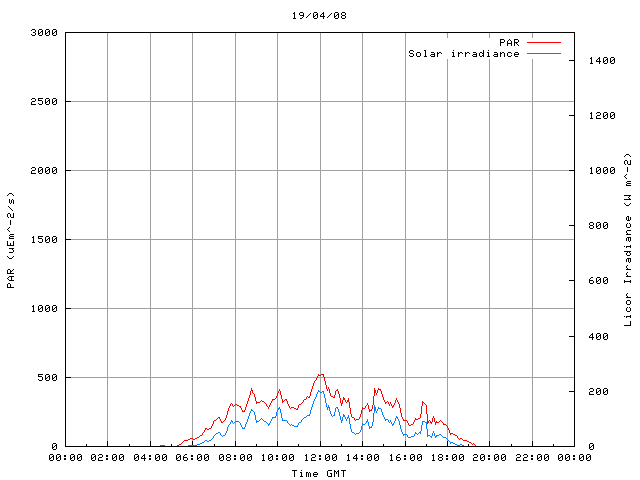 The PML meteorological station, situated on the south-west corner of the building roof, consists of a Hygroclip S3 temperature and humidity sensor housed in a radiation shield, a Mierij Meteo solid state wind sensor (MMW-005), a Chelsea instruments half-hemisphere PAR sensor, a Li-Cor pyranometer (LI-200SZ) and an Omni Instruments 6" tipping bucket raingauge (RG200). The data are logged every 5 minutes using a Pace Scientific XR5 data logger. The real-time rainfall data is likely in error - the correct values will be displayed after a time lag of approximately 24 hours. The meteorological station is sheltered from winds in the north-east and underestimates winds from this quarter. To use these data please contact Dr Tim Smyth.