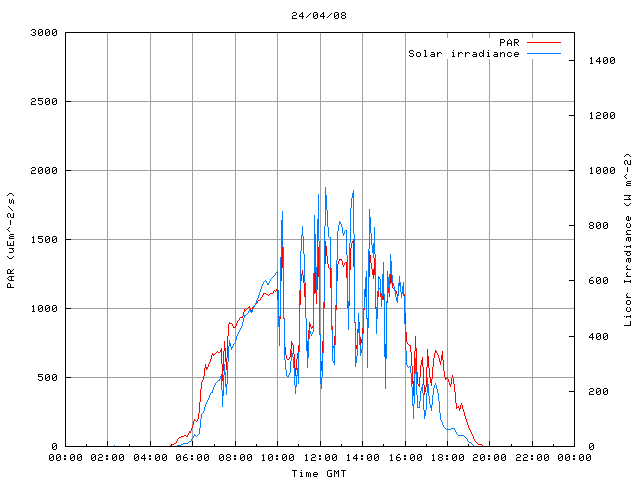 The PML meteorological station, situated on the south-west corner of the building roof, consists of a Hygroclip S3 temperature and humidity sensor housed in a radiation shield, a Mierij Meteo solid state wind sensor (MMW-005), a Chelsea instruments half-hemisphere PAR sensor, a Li-Cor pyranometer (LI-200SZ) and an Omni Instruments 6" tipping bucket raingauge (RG200). The data are logged every 5 minutes using a Pace Scientific XR5 data logger. The real-time rainfall data is likely in error - the correct values will be displayed after a time lag of approximately 24 hours. The meteorological station is sheltered from winds in the north-east and underestimates winds from this quarter. To use these data please contact Dr Tim Smyth.