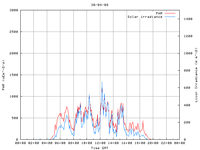 The PML meteorological station, situated on the south-west corner of the building roof, consists of a Hygroclip S3 temperature and humidity sensor housed in a radiation shield, a Mierij Meteo solid state wind sensor (MMW-005), a Chelsea instruments half-hemisphere PAR sensor, a Li-Cor pyranometer (LI-200SZ) and an Omni Instruments 6" tipping bucket raingauge (RG200). The data are logged every 5 minutes using a Pace Scientific XR5 data logger. The real-time rainfall data is likely in error - the correct values will be displayed after a time lag of approximately 24 hours. The meteorological station is sheltered from winds in the north-east and underestimates winds from this quarter. To use these data please contact Dr Tim Smyth.