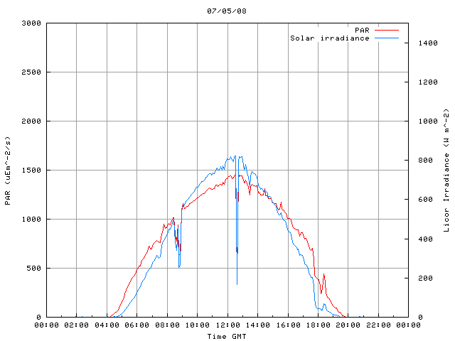 The PML meteorological station, situated on the south-west corner of the building roof, consists of a Hygroclip S3 temperature and humidity sensor housed in a radiation shield, a Mierij Meteo solid state wind sensor (MMW-005), a Chelsea instruments half-hemisphere PAR sensor, a Li-Cor pyranometer (LI-200SZ) and an Omni Instruments 6" tipping bucket raingauge (RG200). The data are logged every 5 minutes using a Pace Scientific XR5 data logger. The real-time rainfall data is likely in error - the correct values will be displayed after a time lag of approximately 24 hours. The meteorological station is sheltered from winds in the north-east and underestimates winds from this quarter. To use these data please contact Dr Tim Smyth.