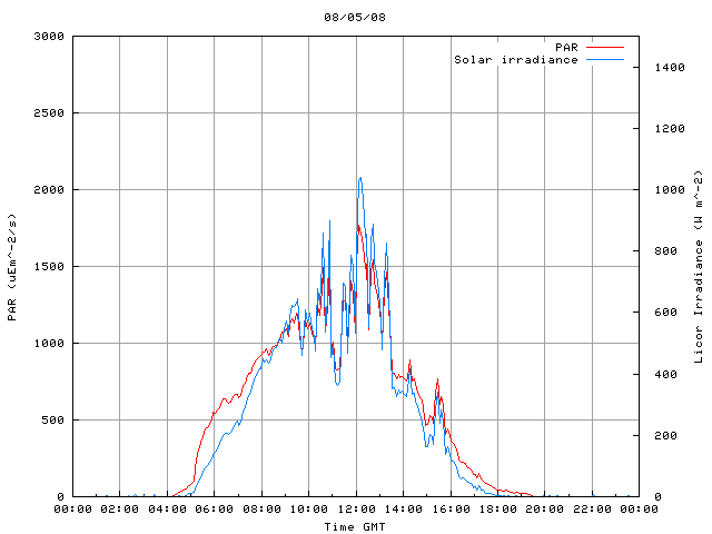 The PML meteorological station, situated on the south-west corner of the building roof, consists of a Hygroclip S3 temperature and humidity sensor housed in a radiation shield, a Mierij Meteo solid state wind sensor (MMW-005), a Chelsea instruments half-hemisphere PAR sensor, a Li-Cor pyranometer (LI-200SZ) and an Omni Instruments 6" tipping bucket raingauge (RG200). The data are logged every 5 minutes using a Pace Scientific XR5 data logger. The real-time rainfall data is likely in error - the correct values will be displayed after a time lag of approximately 24 hours. The meteorological station is sheltered from winds in the north-east and underestimates winds from this quarter. To use these data please contact Dr Tim Smyth.