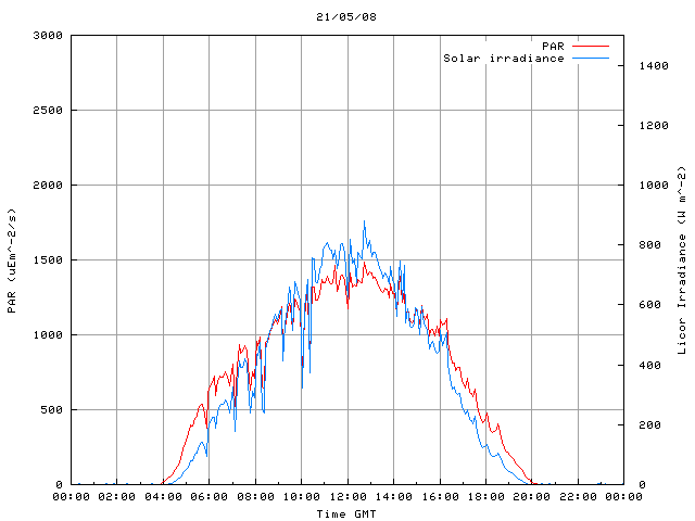 The PML meteorological station, situated on the south-west corner of the building roof, consists of a Hygroclip S3 temperature and humidity sensor housed in a radiation shield, a Mierij Meteo solid state wind sensor (MMW-005), a Chelsea instruments half-hemisphere PAR sensor, a Li-Cor pyranometer (LI-200SZ) and an Omni Instruments 6" tipping bucket raingauge (RG200). The data are logged every 5 minutes using a Pace Scientific XR5 data logger. The real-time rainfall data is likely in error - the correct values will be displayed after a time lag of approximately 24 hours. The meteorological station is sheltered from winds in the north-east and underestimates winds from this quarter. To use these data please contact Dr Tim Smyth.