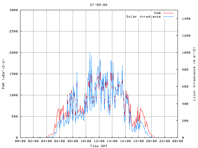 The PML meteorological station, situated on the south-west corner of the building roof, consists of a Hygroclip S3 temperature and humidity sensor housed in a radiation shield, a Mierij Meteo solid state wind sensor (MMW-005), a Chelsea instruments half-hemisphere PAR sensor, a Li-Cor pyranometer (LI-200SZ) and an Omni Instruments 6" tipping bucket raingauge (RG200). The data are logged every 5 minutes using a Pace Scientific XR5 data logger. The real-time rainfall data is likely in error - the correct values will be displayed after a time lag of approximately 24 hours. The meteorological station is sheltered from winds in the north-east and underestimates winds from this quarter. To use these data please contact Dr Tim Smyth.