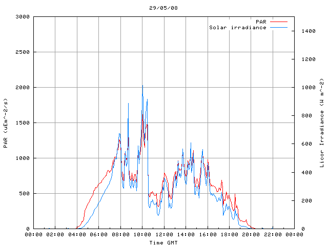The PML meteorological station, situated on the south-west corner of the building roof, consists of a Hygroclip S3 temperature and humidity sensor housed in a radiation shield, a Mierij Meteo solid state wind sensor (MMW-005), a Chelsea instruments half-hemisphere PAR sensor, a Li-Cor pyranometer (LI-200SZ) and an Omni Instruments 6" tipping bucket raingauge (RG200). The data are logged every 5 minutes using a Pace Scientific XR5 data logger. The real-time rainfall data is likely in error - the correct values will be displayed after a time lag of approximately 24 hours. The meteorological station is sheltered from winds in the north-east and underestimates winds from this quarter. To use these data please contact Dr Tim Smyth.