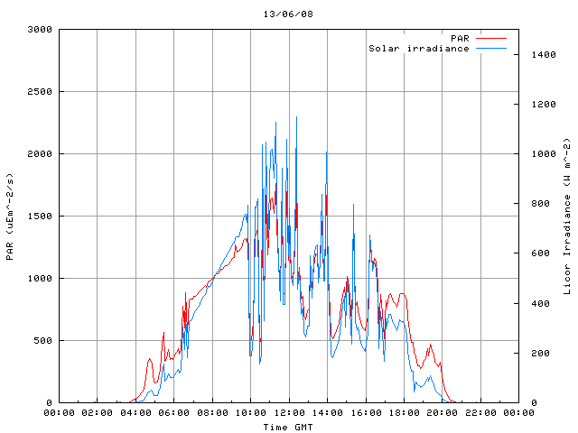 The PML meteorological station, situated on the south-west corner of the building roof, consists of a Hygroclip S3 temperature and humidity sensor housed in a radiation shield, a Mierij Meteo solid state wind sensor (MMW-005), a Chelsea instruments half-hemisphere PAR sensor, a Li-Cor pyranometer (LI-200SZ) and an Omni Instruments 6" tipping bucket raingauge (RG200). The data are logged every 5 minutes using a Pace Scientific XR5 data logger. The real-time rainfall data is likely in error - the correct values will be displayed after a time lag of approximately 24 hours. The meteorological station is sheltered from winds in the north-east and underestimates winds from this quarter. To use these data please contact Dr Tim Smyth.