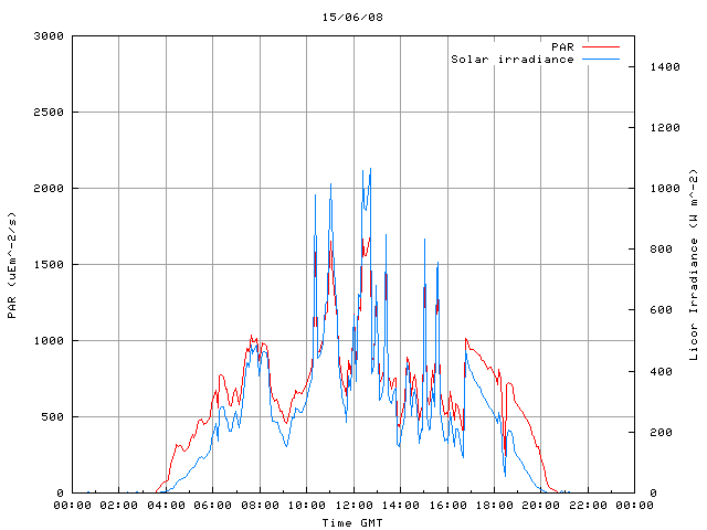 The PML meteorological station, situated on the south-west corner of the building roof, consists of a Hygroclip S3 temperature and humidity sensor housed in a radiation shield, a Mierij Meteo solid state wind sensor (MMW-005), a Chelsea instruments half-hemisphere PAR sensor, a Li-Cor pyranometer (LI-200SZ) and an Omni Instruments 6" tipping bucket raingauge (RG200). The data are logged every 5 minutes using a Pace Scientific XR5 data logger. The real-time rainfall data is likely in error - the correct values will be displayed after a time lag of approximately 24 hours. The meteorological station is sheltered from winds in the north-east and underestimates winds from this quarter. To use these data please contact Dr Tim Smyth.