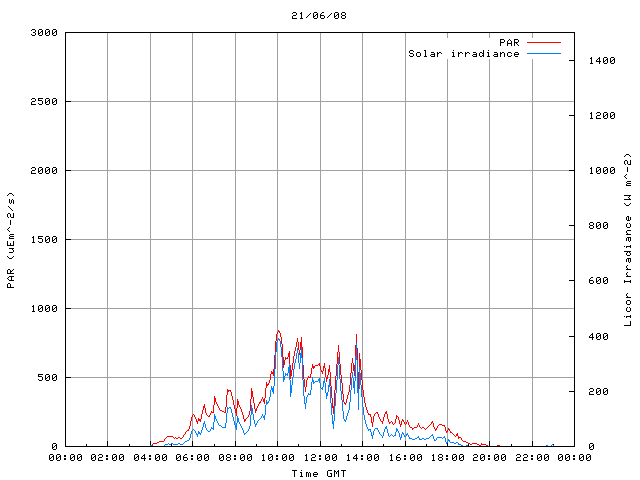 The PML meteorological station, situated on the south-west corner of the building roof, consists of a Hygroclip S3 temperature and humidity sensor housed in a radiation shield, a Mierij Meteo solid state wind sensor (MMW-005), a Chelsea instruments half-hemisphere PAR sensor, a Li-Cor pyranometer (LI-200SZ) and an Omni Instruments 6" tipping bucket raingauge (RG200). The data are logged every 5 minutes using a Pace Scientific XR5 data logger. The real-time rainfall data is likely in error - the correct values will be displayed after a time lag of approximately 24 hours. The meteorological station is sheltered from winds in the north-east and underestimates winds from this quarter. To use these data please contact Dr Tim Smyth.