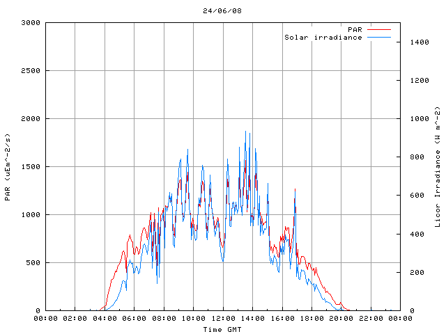 The PML meteorological station, situated on the south-west corner of the building roof, consists of a Hygroclip S3 temperature and humidity sensor housed in a radiation shield, a Mierij Meteo solid state wind sensor (MMW-005), a Chelsea instruments half-hemisphere PAR sensor, a Li-Cor pyranometer (LI-200SZ) and an Omni Instruments 6" tipping bucket raingauge (RG200). The data are logged every 5 minutes using a Pace Scientific XR5 data logger. The real-time rainfall data is likely in error - the correct values will be displayed after a time lag of approximately 24 hours. The meteorological station is sheltered from winds in the north-east and underestimates winds from this quarter. To use these data please contact Dr Tim Smyth.