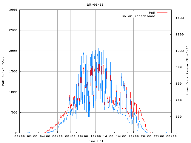 The PML meteorological station, situated on the south-west corner of the building roof, consists of a Hygroclip S3 temperature and humidity sensor housed in a radiation shield, a Mierij Meteo solid state wind sensor (MMW-005), a Chelsea instruments half-hemisphere PAR sensor, a Li-Cor pyranometer (LI-200SZ) and an Omni Instruments 6" tipping bucket raingauge (RG200). The data are logged every 5 minutes using a Pace Scientific XR5 data logger. The real-time rainfall data is likely in error - the correct values will be displayed after a time lag of approximately 24 hours. The meteorological station is sheltered from winds in the north-east and underestimates winds from this quarter. To use these data please contact Dr Tim Smyth.