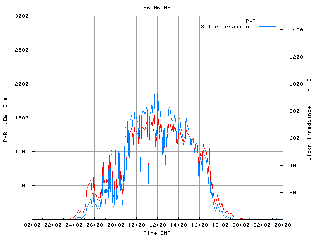 The PML meteorological station, situated on the south-west corner of the building roof, consists of a Hygroclip S3 temperature and humidity sensor housed in a radiation shield, a Mierij Meteo solid state wind sensor (MMW-005), a Chelsea instruments half-hemisphere PAR sensor, a Li-Cor pyranometer (LI-200SZ) and an Omni Instruments 6" tipping bucket raingauge (RG200). The data are logged every 5 minutes using a Pace Scientific XR5 data logger. The real-time rainfall data is likely in error - the correct values will be displayed after a time lag of approximately 24 hours. The meteorological station is sheltered from winds in the north-east and underestimates winds from this quarter. To use these data please contact Dr Tim Smyth.