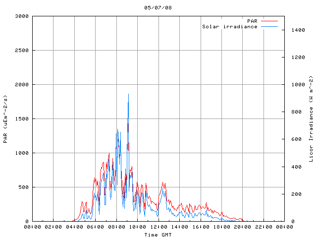 The PML meteorological station, situated on the south-west corner of the building roof, consists of a Hygroclip S3 temperature and humidity sensor housed in a radiation shield, a Mierij Meteo solid state wind sensor (MMW-005), a Chelsea instruments half-hemisphere PAR sensor, a Li-Cor pyranometer (LI-200SZ) and an Omni Instruments 6" tipping bucket raingauge (RG200). The data are logged every 5 minutes using a Pace Scientific XR5 data logger. The real-time rainfall data is likely in error - the correct values will be displayed after a time lag of approximately 24 hours. The meteorological station is sheltered from winds in the north-east and underestimates winds from this quarter. To use these data please contact Dr Tim Smyth.