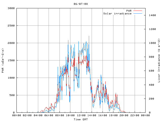 The PML meteorological station, situated on the south-west corner of the building roof, consists of a Hygroclip S3 temperature and humidity sensor housed in a radiation shield, a Mierij Meteo solid state wind sensor (MMW-005), a Chelsea instruments half-hemisphere PAR sensor, a Li-Cor pyranometer (LI-200SZ) and an Omni Instruments 6" tipping bucket raingauge (RG200). The data are logged every 5 minutes using a Pace Scientific XR5 data logger. The real-time rainfall data is likely in error - the correct values will be displayed after a time lag of approximately 24 hours. The meteorological station is sheltered from winds in the north-east and underestimates winds from this quarter. To use these data please contact Dr Tim Smyth.