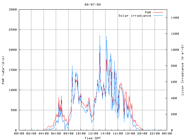 The PML meteorological station, situated on the south-west corner of the building roof, consists of a Hygroclip S3 temperature and humidity sensor housed in a radiation shield, a Mierij Meteo solid state wind sensor (MMW-005), a Chelsea instruments half-hemisphere PAR sensor, a Li-Cor pyranometer (LI-200SZ) and an Omni Instruments 6" tipping bucket raingauge (RG200). The data are logged every 5 minutes using a Pace Scientific XR5 data logger. The real-time rainfall data is likely in error - the correct values will be displayed after a time lag of approximately 24 hours. The meteorological station is sheltered from winds in the north-east and underestimates winds from this quarter. To use these data please contact Dr Tim Smyth.