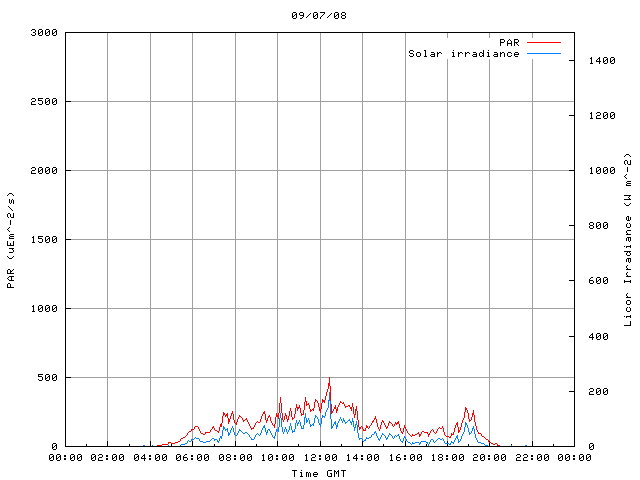The PML meteorological station, situated on the south-west corner of the building roof, consists of a Hygroclip S3 temperature and humidity sensor housed in a radiation shield, a Mierij Meteo solid state wind sensor (MMW-005), a Chelsea instruments half-hemisphere PAR sensor, a Li-Cor pyranometer (LI-200SZ) and an Omni Instruments 6" tipping bucket raingauge (RG200). The data are logged every 5 minutes using a Pace Scientific XR5 data logger. The real-time rainfall data is likely in error - the correct values will be displayed after a time lag of approximately 24 hours. The meteorological station is sheltered from winds in the north-east and underestimates winds from this quarter. To use these data please contact Dr Tim Smyth.