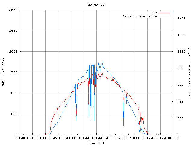 The PML meteorological station, situated on the south-west corner of the building roof, consists of a Hygroclip S3 temperature and humidity sensor housed in a radiation shield, a Mierij Meteo solid state wind sensor (MMW-005), a Chelsea instruments half-hemisphere PAR sensor, a Li-Cor pyranometer (LI-200SZ) and an Omni Instruments 6" tipping bucket raingauge (RG200). The data are logged every 5 minutes using a Pace Scientific XR5 data logger. The real-time rainfall data is likely in error - the correct values will be displayed after a time lag of approximately 24 hours. The meteorological station is sheltered from winds in the north-east and underestimates winds from this quarter. To use these data please contact Dr Tim Smyth.