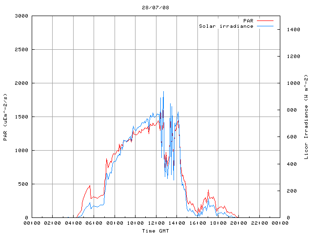 The PML meteorological station, situated on the south-west corner of the building roof, consists of a Hygroclip S3 temperature and humidity sensor housed in a radiation shield, a Mierij Meteo solid state wind sensor (MMW-005), a Chelsea instruments half-hemisphere PAR sensor, a Li-Cor pyranometer (LI-200SZ) and an Omni Instruments 6" tipping bucket raingauge (RG200). The data are logged every 5 minutes using a Pace Scientific XR5 data logger. The real-time rainfall data is likely in error - the correct values will be displayed after a time lag of approximately 24 hours. The meteorological station is sheltered from winds in the north-east and underestimates winds from this quarter. To use these data please contact Dr Tim Smyth.