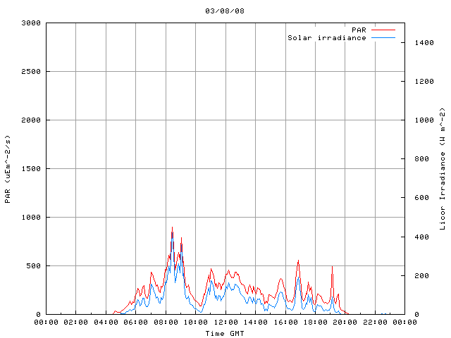 The PML meteorological station, situated on the south-west corner of the building roof, consists of a Hygroclip S3 temperature and humidity sensor housed in a radiation shield, a Mierij Meteo solid state wind sensor (MMW-005), a Chelsea instruments half-hemisphere PAR sensor, a Li-Cor pyranometer (LI-200SZ) and an Omni Instruments 6" tipping bucket raingauge (RG200). The data are logged every 5 minutes using a Pace Scientific XR5 data logger. The real-time rainfall data is likely in error - the correct values will be displayed after a time lag of approximately 24 hours. The meteorological station is sheltered from winds in the north-east and underestimates winds from this quarter. To use these data please contact Dr Tim Smyth.