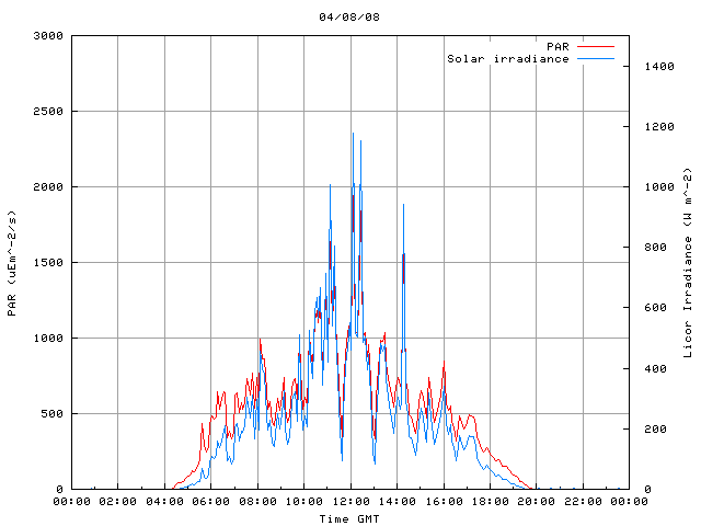 The PML meteorological station, situated on the south-west corner of the building roof, consists of a Hygroclip S3 temperature and humidity sensor housed in a radiation shield, a Mierij Meteo solid state wind sensor (MMW-005), a Chelsea instruments half-hemisphere PAR sensor, a Li-Cor pyranometer (LI-200SZ) and an Omni Instruments 6" tipping bucket raingauge (RG200). The data are logged every 5 minutes using a Pace Scientific XR5 data logger. The real-time rainfall data is likely in error - the correct values will be displayed after a time lag of approximately 24 hours. The meteorological station is sheltered from winds in the north-east and underestimates winds from this quarter. To use these data please contact Dr Tim Smyth.