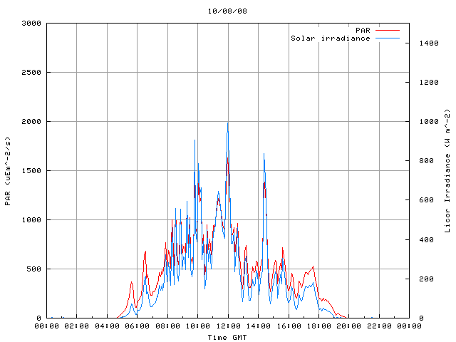 The PML meteorological station, situated on the south-west corner of the building roof, consists of a Hygroclip S3 temperature and humidity sensor housed in a radiation shield, a Mierij Meteo solid state wind sensor (MMW-005), a Chelsea instruments half-hemisphere PAR sensor, a Li-Cor pyranometer (LI-200SZ) and an Omni Instruments 6" tipping bucket raingauge (RG200). The data are logged every 5 minutes using a Pace Scientific XR5 data logger. The real-time rainfall data is likely in error - the correct values will be displayed after a time lag of approximately 24 hours. The meteorological station is sheltered from winds in the north-east and underestimates winds from this quarter. To use these data please contact Dr Tim Smyth.