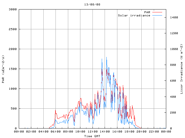 The PML meteorological station, situated on the south-west corner of the building roof, consists of a Hygroclip S3 temperature and humidity sensor housed in a radiation shield, a Mierij Meteo solid state wind sensor (MMW-005), a Chelsea instruments half-hemisphere PAR sensor, a Li-Cor pyranometer (LI-200SZ) and an Omni Instruments 6" tipping bucket raingauge (RG200). The data are logged every 5 minutes using a Pace Scientific XR5 data logger. The real-time rainfall data is likely in error - the correct values will be displayed after a time lag of approximately 24 hours. The meteorological station is sheltered from winds in the north-east and underestimates winds from this quarter. To use these data please contact Dr Tim Smyth.