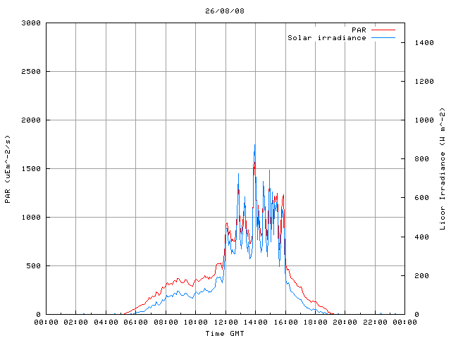 The PML meteorological station, situated on the south-west corner of the building roof, consists of a Hygroclip S3 temperature and humidity sensor housed in a radiation shield, a Mierij Meteo solid state wind sensor (MMW-005), a Chelsea instruments half-hemisphere PAR sensor, a Li-Cor pyranometer (LI-200SZ) and an Omni Instruments 6" tipping bucket raingauge (RG200). The data are logged every 5 minutes using a Pace Scientific XR5 data logger. The real-time rainfall data is likely in error - the correct values will be displayed after a time lag of approximately 24 hours. The meteorological station is sheltered from winds in the north-east and underestimates winds from this quarter. To use these data please contact Dr Tim Smyth.