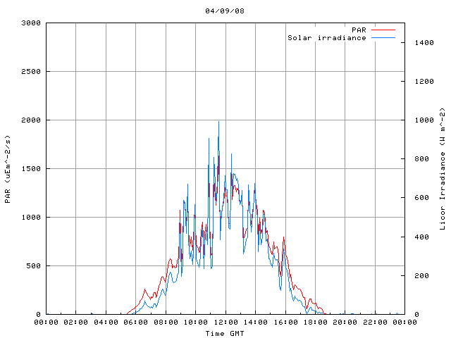 The PML meteorological station, situated on the south-west corner of the building roof, consists of a Hygroclip S3 temperature and humidity sensor housed in a radiation shield, a Mierij Meteo solid state wind sensor (MMW-005), a Chelsea instruments half-hemisphere PAR sensor, a Li-Cor pyranometer (LI-200SZ) and an Omni Instruments 6" tipping bucket raingauge (RG200). The data are logged every 5 minutes using a Pace Scientific XR5 data logger. The real-time rainfall data is likely in error - the correct values will be displayed after a time lag of approximately 24 hours. The meteorological station is sheltered from winds in the north-east and underestimates winds from this quarter. To use these data please contact Dr Tim Smyth.