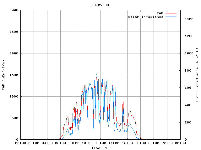 The PML meteorological station, situated on the south-west corner of the building roof, consists of a Hygroclip S3 temperature and humidity sensor housed in a radiation shield, a Mierij Meteo solid state wind sensor (MMW-005), a Chelsea instruments half-hemisphere PAR sensor, a Li-Cor pyranometer (LI-200SZ) and an Omni Instruments 6" tipping bucket raingauge (RG200). The data are logged every 5 minutes using a Pace Scientific XR5 data logger. The real-time rainfall data is likely in error - the correct values will be displayed after a time lag of approximately 24 hours. The meteorological station is sheltered from winds in the north-east and underestimates winds from this quarter. To use these data please contact Dr Tim Smyth.