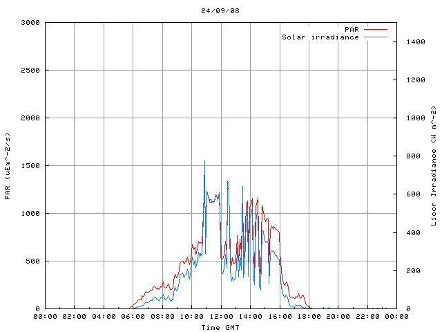 The PML meteorological station, situated on the south-west corner of the building roof, consists of a Hygroclip S3 temperature and humidity sensor housed in a radiation shield, a Mierij Meteo solid state wind sensor (MMW-005), a Chelsea instruments half-hemisphere PAR sensor, a Li-Cor pyranometer (LI-200SZ) and an Omni Instruments 6" tipping bucket raingauge (RG200). The data are logged every 5 minutes using a Pace Scientific XR5 data logger. The real-time rainfall data is likely in error - the correct values will be displayed after a time lag of approximately 24 hours. The meteorological station is sheltered from winds in the north-east and underestimates winds from this quarter. To use these data please contact Dr Tim Smyth.