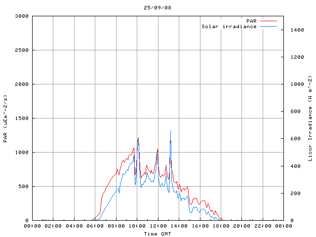 The PML meteorological station, situated on the south-west corner of the building roof, consists of a Hygroclip S3 temperature and humidity sensor housed in a radiation shield, a Mierij Meteo solid state wind sensor (MMW-005), a Chelsea instruments half-hemisphere PAR sensor, a Li-Cor pyranometer (LI-200SZ) and an Omni Instruments 6" tipping bucket raingauge (RG200). The data are logged every 5 minutes using a Pace Scientific XR5 data logger. The real-time rainfall data is likely in error - the correct values will be displayed after a time lag of approximately 24 hours. The meteorological station is sheltered from winds in the north-east and underestimates winds from this quarter. To use these data please contact Dr Tim Smyth.