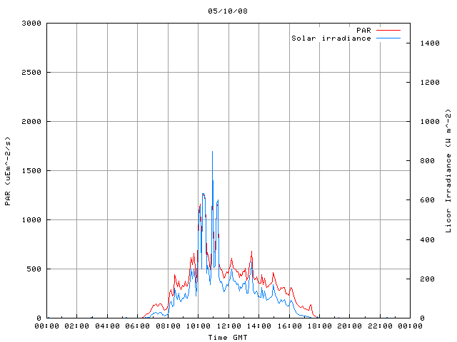The PML meteorological station, situated on the south-west corner of the building roof, consists of a Hygroclip S3 temperature and humidity sensor housed in a radiation shield, a Mierij Meteo solid state wind sensor (MMW-005), a Chelsea instruments half-hemisphere PAR sensor, a Li-Cor pyranometer (LI-200SZ) and an Omni Instruments 6" tipping bucket raingauge (RG200). The data are logged every 5 minutes using a Pace Scientific XR5 data logger. The real-time rainfall data is likely in error - the correct values will be displayed after a time lag of approximately 24 hours. The meteorological station is sheltered from winds in the north-east and underestimates winds from this quarter. To use these data please contact Dr Tim Smyth.