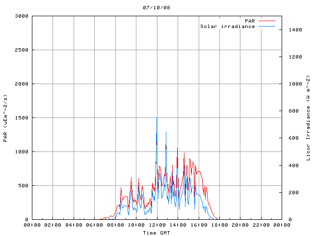 The PML meteorological station, situated on the south-west corner of the building roof, consists of a Hygroclip S3 temperature and humidity sensor housed in a radiation shield, a Mierij Meteo solid state wind sensor (MMW-005), a Chelsea instruments half-hemisphere PAR sensor, a Li-Cor pyranometer (LI-200SZ) and an Omni Instruments 6" tipping bucket raingauge (RG200). The data are logged every 5 minutes using a Pace Scientific XR5 data logger. The real-time rainfall data is likely in error - the correct values will be displayed after a time lag of approximately 24 hours. The meteorological station is sheltered from winds in the north-east and underestimates winds from this quarter. To use these data please contact Dr Tim Smyth.
