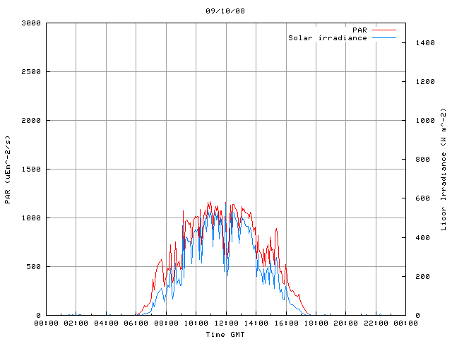 The PML meteorological station, situated on the south-west corner of the building roof, consists of a Hygroclip S3 temperature and humidity sensor housed in a radiation shield, a Mierij Meteo solid state wind sensor (MMW-005), a Chelsea instruments half-hemisphere PAR sensor, a Li-Cor pyranometer (LI-200SZ) and an Omni Instruments 6" tipping bucket raingauge (RG200). The data are logged every 5 minutes using a Pace Scientific XR5 data logger. The real-time rainfall data is likely in error - the correct values will be displayed after a time lag of approximately 24 hours. The meteorological station is sheltered from winds in the north-east and underestimates winds from this quarter. To use these data please contact Dr Tim Smyth.