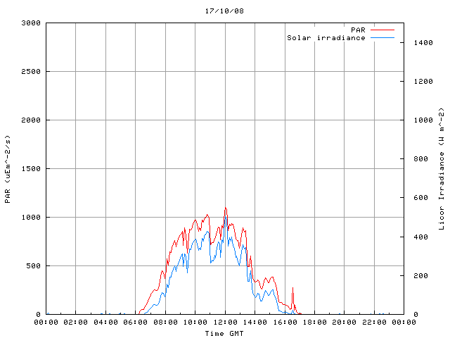 The PML meteorological station, situated on the south-west corner of the building roof, consists of a Hygroclip S3 temperature and humidity sensor housed in a radiation shield, a Mierij Meteo solid state wind sensor (MMW-005), a Chelsea instruments half-hemisphere PAR sensor, a Li-Cor pyranometer (LI-200SZ) and an Omni Instruments 6" tipping bucket raingauge (RG200). The data are logged every 5 minutes using a Pace Scientific XR5 data logger. The real-time rainfall data is likely in error - the correct values will be displayed after a time lag of approximately 24 hours. The meteorological station is sheltered from winds in the north-east and underestimates winds from this quarter. To use these data please contact Dr Tim Smyth.
