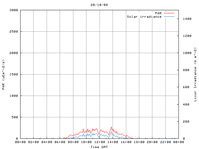 The PML meteorological station, situated on the south-west corner of the building roof, consists of a Hygroclip S3 temperature and humidity sensor housed in a radiation shield, a Mierij Meteo solid state wind sensor (MMW-005), a Chelsea instruments half-hemisphere PAR sensor, a Li-Cor pyranometer (LI-200SZ) and an Omni Instruments 6" tipping bucket raingauge (RG200). The data are logged every 5 minutes using a Pace Scientific XR5 data logger. The real-time rainfall data is likely in error - the correct values will be displayed after a time lag of approximately 24 hours. The meteorological station is sheltered from winds in the north-east and underestimates winds from this quarter. To use these data please contact Dr Tim Smyth.