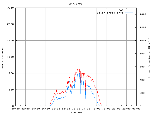 The PML meteorological station, situated on the south-west corner of the building roof, consists of a Hygroclip S3 temperature and humidity sensor housed in a radiation shield, a Mierij Meteo solid state wind sensor (MMW-005), a Chelsea instruments half-hemisphere PAR sensor, a Li-Cor pyranometer (LI-200SZ) and an Omni Instruments 6" tipping bucket raingauge (RG200). The data are logged every 5 minutes using a Pace Scientific XR5 data logger. The real-time rainfall data is likely in error - the correct values will be displayed after a time lag of approximately 24 hours. The meteorological station is sheltered from winds in the north-east and underestimates winds from this quarter. To use these data please contact Dr Tim Smyth.