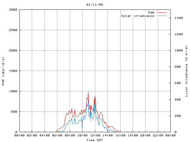 The PML meteorological station, situated on the south-west corner of the building roof, consists of a Hygroclip S3 temperature and humidity sensor housed in a radiation shield, a Mierij Meteo solid state wind sensor (MMW-005), a Chelsea instruments half-hemisphere PAR sensor, a Li-Cor pyranometer (LI-200SZ) and an Omni Instruments 6" tipping bucket raingauge (RG200). The data are logged every 5 minutes using a Pace Scientific XR5 data logger. The real-time rainfall data is likely in error - the correct values will be displayed after a time lag of approximately 24 hours. The meteorological station is sheltered from winds in the north-east and underestimates winds from this quarter. To use these data please contact Dr Tim Smyth.