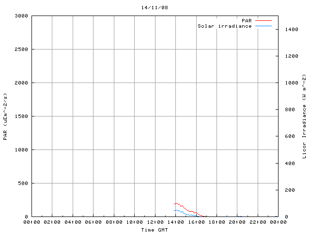 The PML meteorological station, situated on the south-west corner of the building roof, consists of a Hygroclip S3 temperature and humidity sensor housed in a radiation shield, a Mierij Meteo solid state wind sensor (MMW-005), a Chelsea instruments half-hemisphere PAR sensor, a Li-Cor pyranometer (LI-200SZ) and an Omni Instruments 6" tipping bucket raingauge (RG200). The data are logged every 5 minutes using a Pace Scientific XR5 data logger. The real-time rainfall data is likely in error - the correct values will be displayed after a time lag of approximately 24 hours. The meteorological station is sheltered from winds in the north-east and underestimates winds from this quarter. To use these data please contact Dr Tim Smyth.