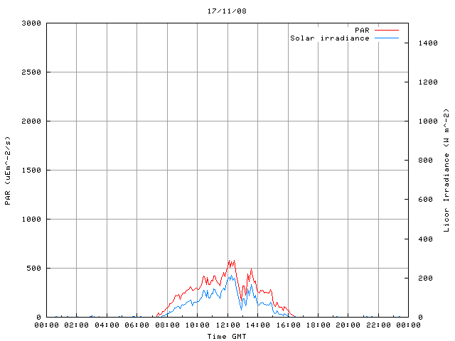 The PML meteorological station, situated on the south-west corner of the building roof, consists of a Hygroclip S3 temperature and humidity sensor housed in a radiation shield, a Mierij Meteo solid state wind sensor (MMW-005), a Chelsea instruments half-hemisphere PAR sensor, a Li-Cor pyranometer (LI-200SZ) and an Omni Instruments 6" tipping bucket raingauge (RG200). The data are logged every 5 minutes using a Pace Scientific XR5 data logger. The real-time rainfall data is likely in error - the correct values will be displayed after a time lag of approximately 24 hours. The meteorological station is sheltered from winds in the north-east and underestimates winds from this quarter. To use these data please contact Dr Tim Smyth.