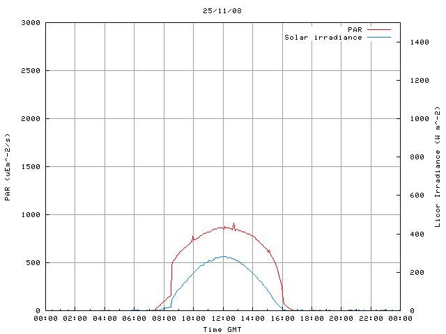 The PML meteorological station, situated on the south-west corner of the building roof, consists of a Hygroclip S3 temperature and humidity sensor housed in a radiation shield, a Mierij Meteo solid state wind sensor (MMW-005), a Chelsea instruments half-hemisphere PAR sensor, a Li-Cor pyranometer (LI-200SZ) and an Omni Instruments 6" tipping bucket raingauge (RG200). The data are logged every 5 minutes using a Pace Scientific XR5 data logger. The real-time rainfall data is likely in error - the correct values will be displayed after a time lag of approximately 24 hours. The meteorological station is sheltered from winds in the north-east and underestimates winds from this quarter. To use these data please contact Dr Tim Smyth.