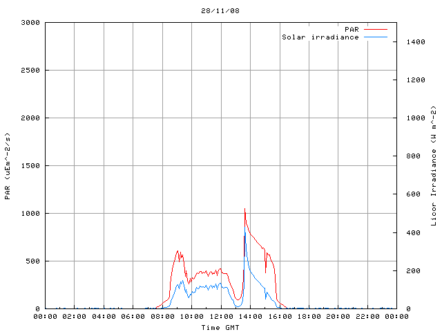 The PML meteorological station, situated on the south-west corner of the building roof, consists of a Hygroclip S3 temperature and humidity sensor housed in a radiation shield, a Mierij Meteo solid state wind sensor (MMW-005), a Chelsea instruments half-hemisphere PAR sensor, a Li-Cor pyranometer (LI-200SZ) and an Omni Instruments 6" tipping bucket raingauge (RG200). The data are logged every 5 minutes using a Pace Scientific XR5 data logger. The real-time rainfall data is likely in error - the correct values will be displayed after a time lag of approximately 24 hours. The meteorological station is sheltered from winds in the north-east and underestimates winds from this quarter. To use these data please contact Dr Tim Smyth.