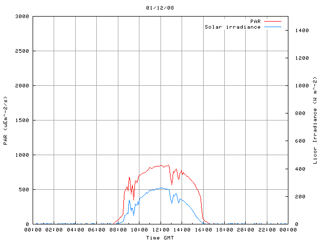 The PML meteorological station, situated on the south-west corner of the building roof, consists of a Hygroclip S3 temperature and humidity sensor housed in a radiation shield, a Mierij Meteo solid state wind sensor (MMW-005), a Chelsea instruments half-hemisphere PAR sensor, a Li-Cor pyranometer (LI-200SZ) and an Omni Instruments 6" tipping bucket raingauge (RG200). The data are logged every 5 minutes using a Pace Scientific XR5 data logger. The real-time rainfall data is likely in error - the correct values will be displayed after a time lag of approximately 24 hours. The meteorological station is sheltered from winds in the north-east and underestimates winds from this quarter. To use these data please contact Dr Tim Smyth.