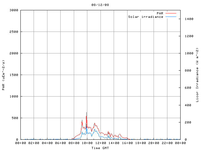 The PML meteorological station, situated on the south-west corner of the building roof, consists of a Hygroclip S3 temperature and humidity sensor housed in a radiation shield, a Mierij Meteo solid state wind sensor (MMW-005), a Chelsea instruments half-hemisphere PAR sensor, a Li-Cor pyranometer (LI-200SZ) and an Omni Instruments 6" tipping bucket raingauge (RG200). The data are logged every 5 minutes using a Pace Scientific XR5 data logger. The real-time rainfall data is likely in error - the correct values will be displayed after a time lag of approximately 24 hours. The meteorological station is sheltered from winds in the north-east and underestimates winds from this quarter. To use these data please contact Dr Tim Smyth.