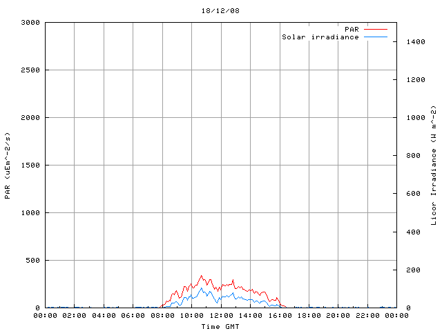 The PML meteorological station, situated on the south-west corner of the building roof, consists of a Hygroclip S3 temperature and humidity sensor housed in a radiation shield, a Mierij Meteo solid state wind sensor (MMW-005), a Chelsea instruments half-hemisphere PAR sensor, a Li-Cor pyranometer (LI-200SZ) and an Omni Instruments 6" tipping bucket raingauge (RG200). The data are logged every 5 minutes using a Pace Scientific XR5 data logger. The real-time rainfall data is likely in error - the correct values will be displayed after a time lag of approximately 24 hours. The meteorological station is sheltered from winds in the north-east and underestimates winds from this quarter. To use these data please contact Dr Tim Smyth.