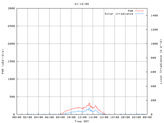 The PML meteorological station, situated on the south-west corner of the building roof, consists of a Hygroclip S3 temperature and humidity sensor housed in a radiation shield, a Mierij Meteo solid state wind sensor (MMW-005), a Chelsea instruments half-hemisphere PAR sensor, a Li-Cor pyranometer (LI-200SZ) and an Omni Instruments 6" tipping bucket raingauge (RG200). The data are logged every 5 minutes using a Pace Scientific XR5 data logger. The real-time rainfall data is likely in error - the correct values will be displayed after a time lag of approximately 24 hours. The meteorological station is sheltered from winds in the north-east and underestimates winds from this quarter. To use these data please contact Dr Tim Smyth.