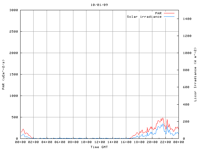 The PML meteorological station, situated on the south-west corner of the building roof, consists of a Hygroclip S3 temperature and humidity sensor housed in a radiation shield, a Mierij Meteo solid state wind sensor (MMW-005), a Chelsea instruments half-hemisphere PAR sensor, a Li-Cor pyranometer (LI-200SZ) and an Omni Instruments 6" tipping bucket raingauge (RG200). The data are logged every 5 minutes using a Pace Scientific XR5 data logger. The real-time rainfall data is likely in error - the correct values will be displayed after a time lag of approximately 24 hours. The meteorological station is sheltered from winds in the north-east and underestimates winds from this quarter. To use these data please contact Dr Tim Smyth.